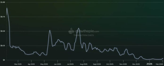 Ethereum mainnet transaction costs declined from peaks above $0.50 in early 2025 to near-zero levels by February 2026, reflecting sustained low fee pressure.
