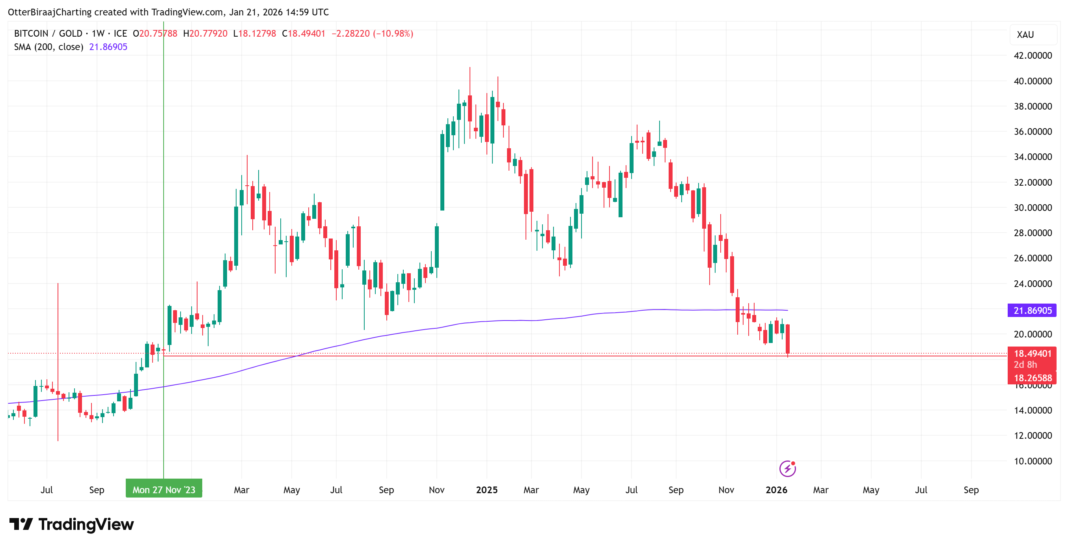 The Bitcoin-to-gold ratio measures how many ounces of gold are required to buy one Bitcoin. The ratio slid to about 18.5 on Wednesday, dropping to its lowest value since November 2023. The move reflects gold pushing to new all-time highs of $4,888 while Bitcoin struggles to hold above $90,000.